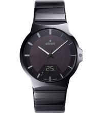Die Armbanduhr verfügt über ein schwarzes Gehäuse, aus Keramik gefertigt, das durch die Polierte Oberfläche wie ein echter Eyecatcher wirkt.