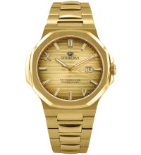 Die Armbanduhr verfügt über ein goldenes Gehäuse, aus Edelstahl gefertigt, das durch die Mattiert, Polierte Oberfläche wie ein echter Eyecatcher wirkt.