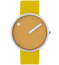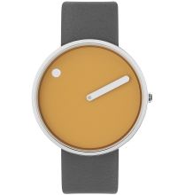 Picto® stellt die Idee einer klassischen Uhr mit zwei Zeigern und einem Zifferblatt mit Zahlen in Frage. Hier wird die Stunde durch einen Punkt auf dem drehbaren Zifferblatt angezeigt, während die Minuten durch einen herkömmlichen Zeiger angezeigt werden. |  |