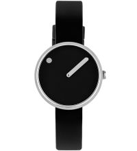 Picto® stellt die Idee einer klassischen Uhr mit zwei Zeigern und einem Zifferblatt mit Zahlen in Frage. Hier wird die Stunde durch einen Punkt auf dem drehbaren Zifferblatt angezeigt, während die Minuten durch einen herkömmlichen Zeiger angezeigt werden. |  |