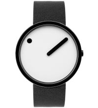 Picto® stellt die Idee einer klassischen Uhr mit zwei Zeigern und einem Zifferblatt mit Zahlen in Frage. Hier wird die Stunde durch einen Punkt auf dem drehbaren Zifferblatt angezeigt, während die Minuten durch einen herkömmlichen Zeiger angezeigt werden. |  |